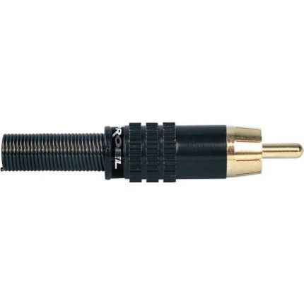The Proel MRCA20BK RCA cable mount male plug with nickel plated brass shell and Ø 6.2 mm flexible cable spring. Colour: Silver with black shell ring.