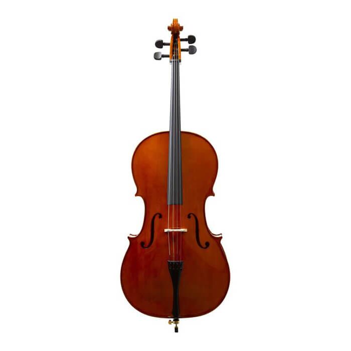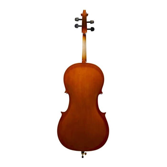 3/4 cello, solid spruce top, back and side, dyed hardwood fingerboard and pegs. Metal tailpiece with 4 finetuner. Blue bag, entry level plus bow, Rosin