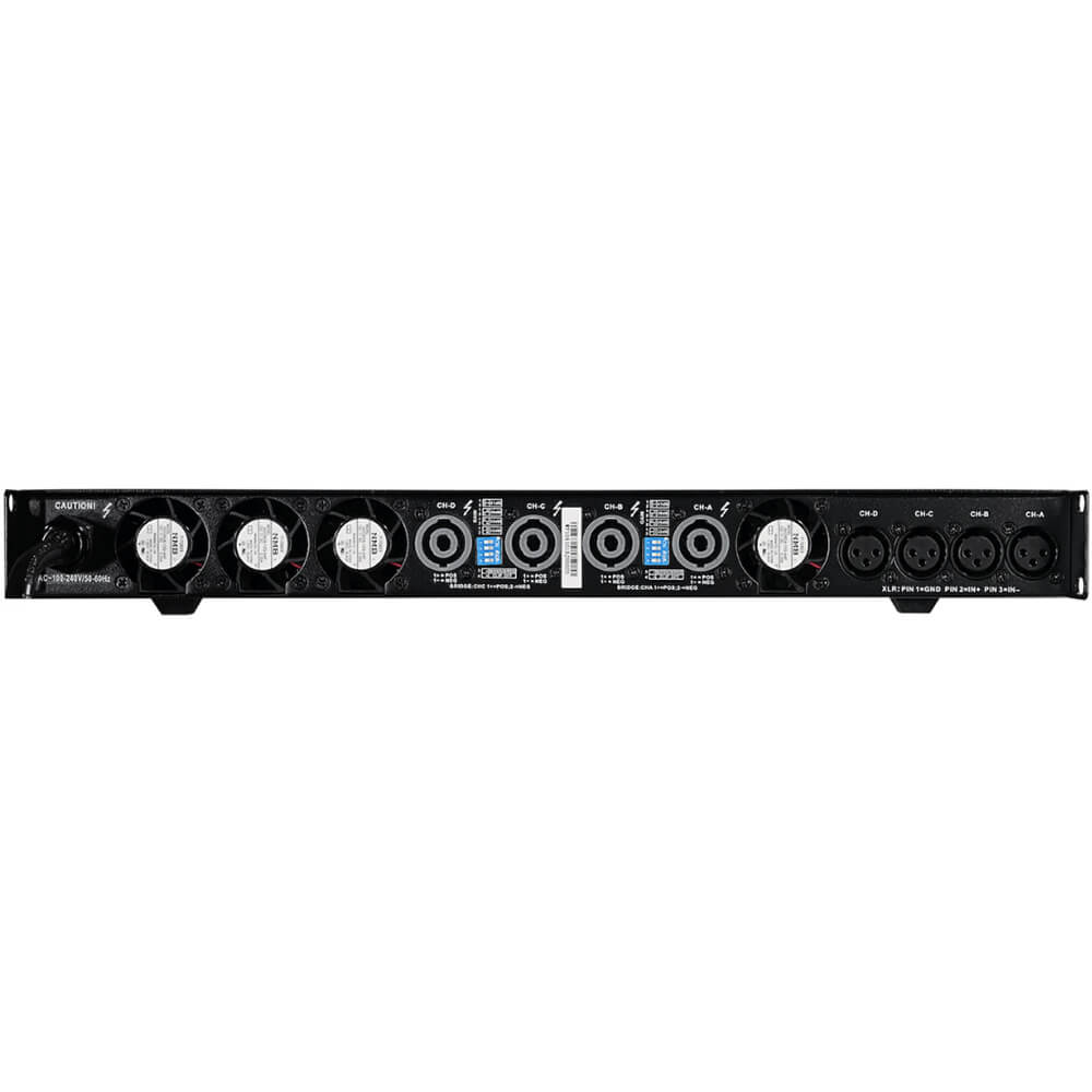 Suitable for professional live sound reinforcement or fixed installations, the 4-channel DP-4065 delivers extreme power from a light weight box. Its advanced switch mode power supply and super-efficient Class D topology delivers high power with low distortion. With 4 discrete channels and multiple operating modes its simple to configure into the most complex of installations or touring rigs.